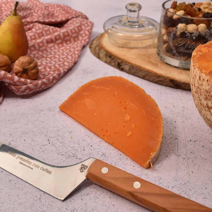 Sous sa croûte rugueuse, la pâte orange offre un parfum de noix fraîche et de cave, tandis que la dégustation révèle des notes de caramel, de grillé, voire de café, avec une finale légèrement sucrée et salée.